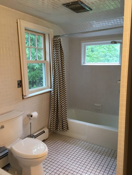 This Staatsburg bathroom renovation features striking encaustic tile, ceramic tiles in which the pattern or figure on the surface is not a product of the glaze but of different colors of clay. The pattern appears inlaid into the body of the tile so that the design remains as the tile ages. A Runtal heater, from a Swiss-owned company renowned for radiator technology and special design, provides optimum comfort and efficiency in radiant heating.