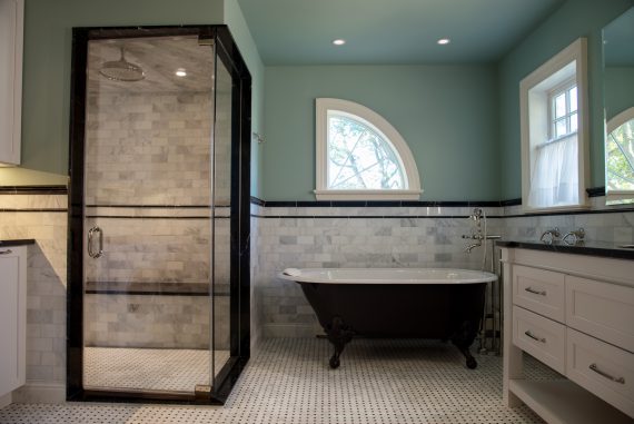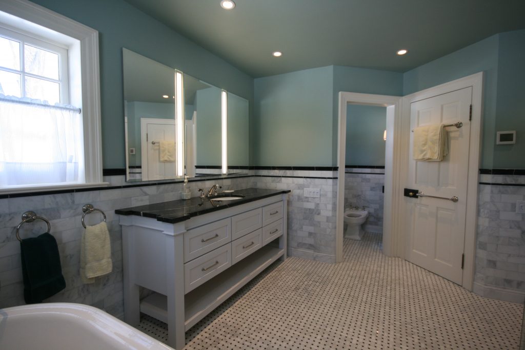 We retiled and completely updated this master bathroom at a 28-year-old neocolonial in Stanfordville, with soothing, spa-like colors and classic fixtures.